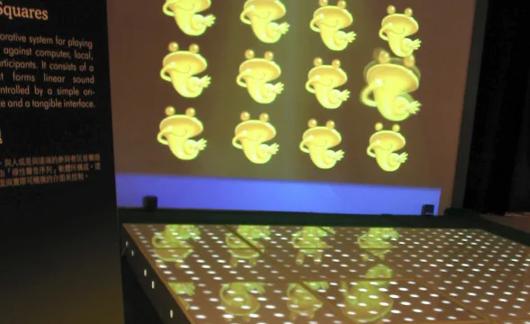 Musical squares is a simple collaborative system for playing musical games against computer, local, and remote participants. It consists of a "software that forms linear sound sequences" controlled by a simple on-screen interface and a tangible interface. The sound is created by stepping on a series of 16 large pads. Each pad has a light display inside and is clickable much like a large button. All the pads are connected together by a wireless sensor which Early prototype transmits data back to a PC. There are also a series of 7 pads elevated to waste height which allow for control over the selection of games. Visible feedback is provided by both the pads and a projected display. Auditory feedback is provided by a series of speakers. Musical squares is designed for children but should appeal to participants of all ages. Watch the demo 1, demo 2.